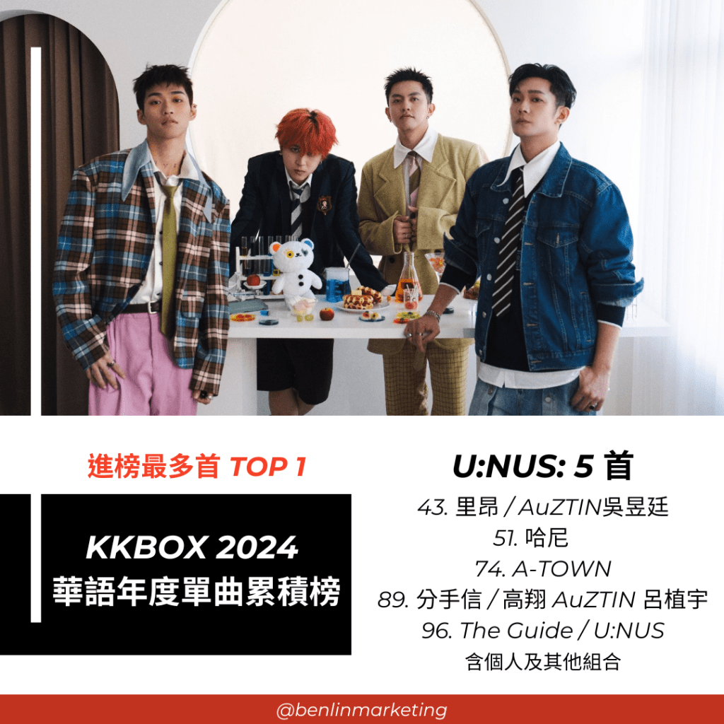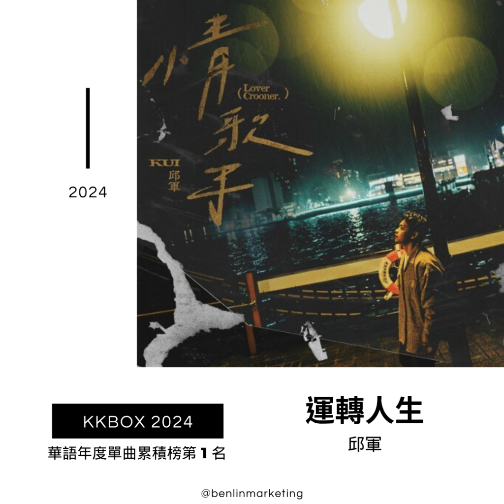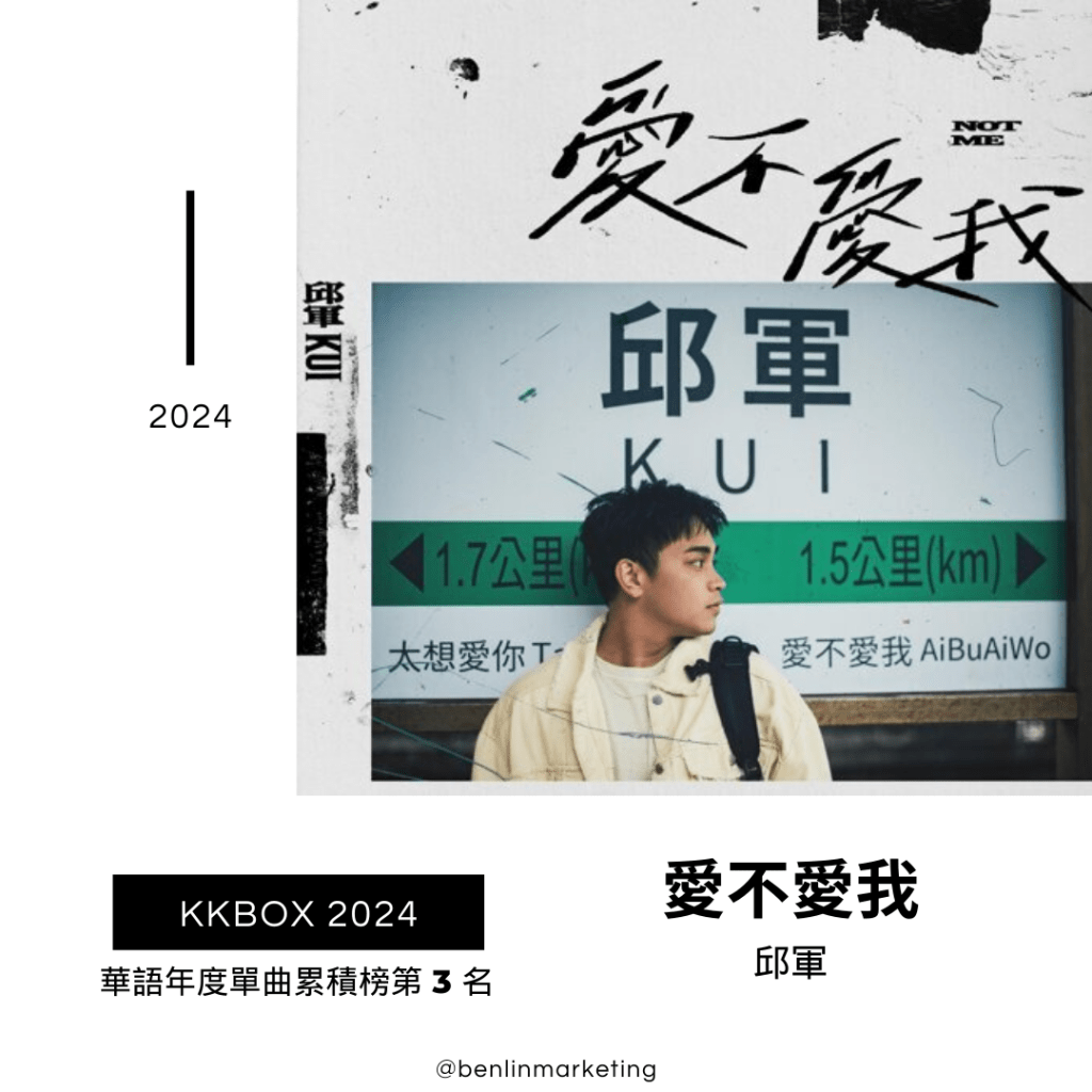 KKBOX 2024 華語年度單曲累積榜,邱軍以〈運轉人生〉奪下冠軍、另一首〈愛不愛我〉高居第3名、〈太想愛你〉也躋身第9名,Energy 則以〈星期五晚上〉及〈分合〉分居第2及第4名;邱軍和 Energy 均擁有 5 首 進百大,同樣進榜 5 首的還有動力火車及U:NUS(含個人及其他組合)。